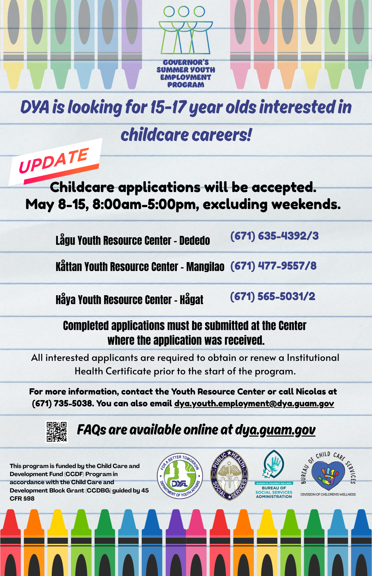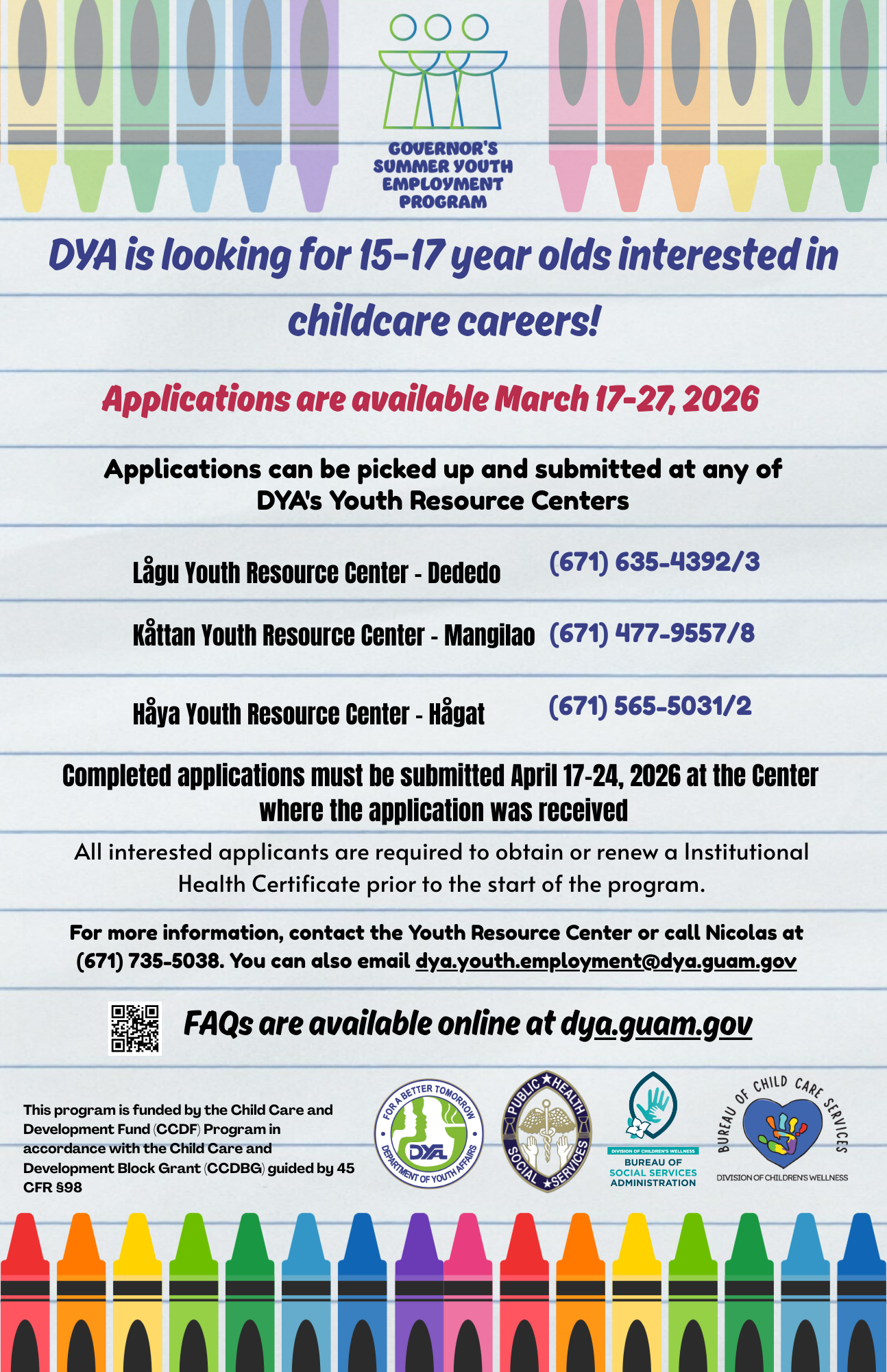 The mission of the Department of Youth Affairs (DYA) is to improve the quality of life on Guam for all people by the development and implementation of programs and services that promote positive youth development, decrease juvenile delinquency and status offenses, hold youth accountable for their actions and provide them with appropriate treatment and opportunities to succeed in the community.